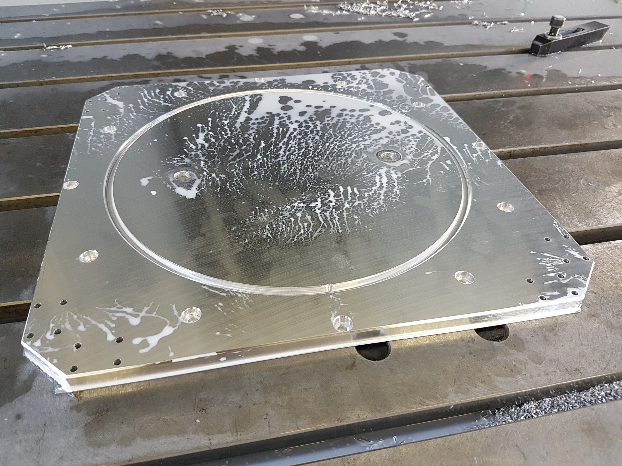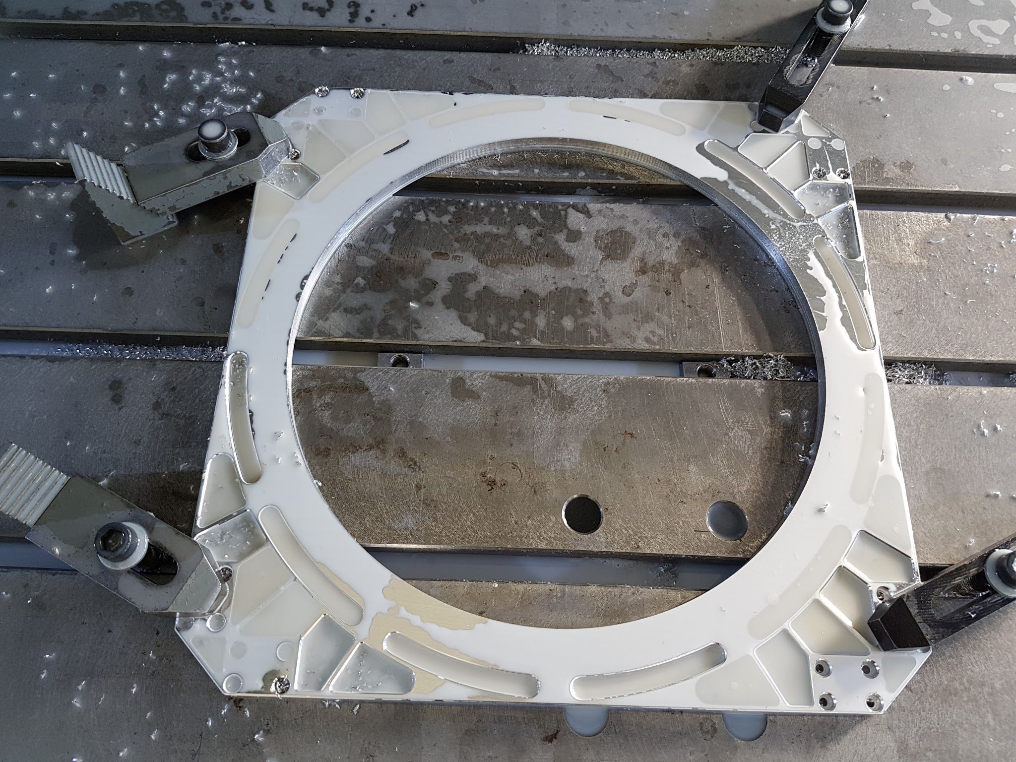 Nadišiel krok, pri ktorom začali z kusov materiálu vznikať prvé súčiastky. Výkonným pomocníkom sa stala fréza HAAS VF8. S ľahokosťou (priam eleganciou) dokáže opracovať aj tie najmenšie detaily. S jej výdatnou pomocou sa púšťame do zadnej platne držiacej primárne zrkadlo a budeme postupovať smerom k sekundárnej časti.