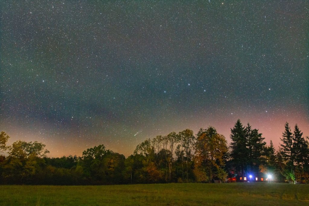 Kométa C/2025 A6 (Lemmon) z 18. 10. 2025 nízko nad severozápadným obzorom pod Veľkým vozom. Obrázok „prikrášlil“ zelený airglow a červená polárna žiara.