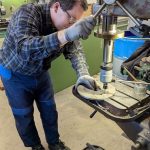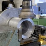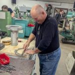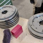 Počas predchádzajúcich dní nám Martin pripravil disky, ktoré budú slúžiť ako pohonné disky a prstence na montáž enkoderových pásikov. Všetky diely boli vyrobené z antikory. Do všetkých bolo treba vyvŕtať príslušné diery a narezať závity. Našťastie na rezanie závitov mal Martin výbornú vychytávku – automatickú hlavu s prevodom a nastaviteľným momentom.