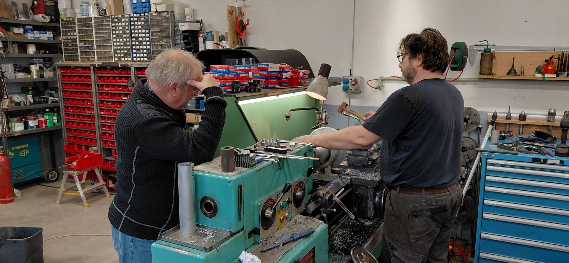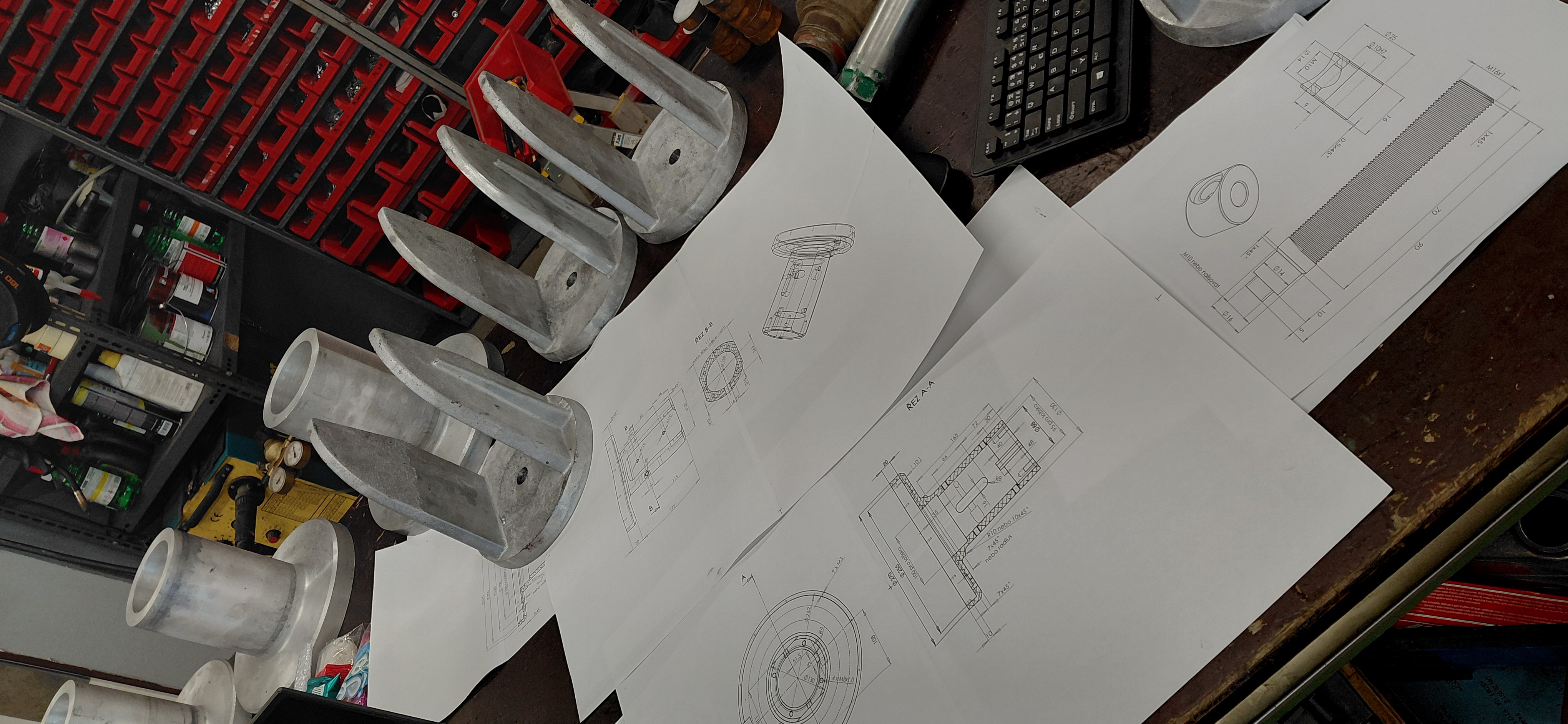 Medzitým Martin dokončoval puzdrá na RA os. Pomáhalo mu k tomu kopec výkresov a odborný dozor v podobe Peťa. Zvedavosť ho našťastie premohla a prišiel sa pozrieť čo tu kutíme.