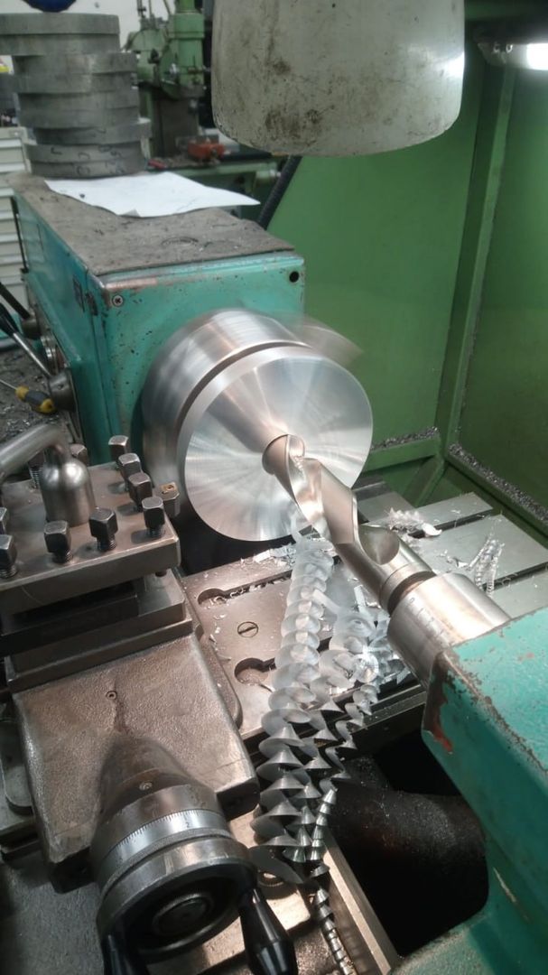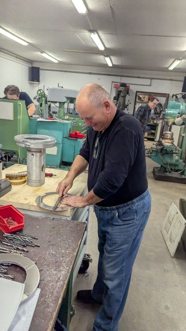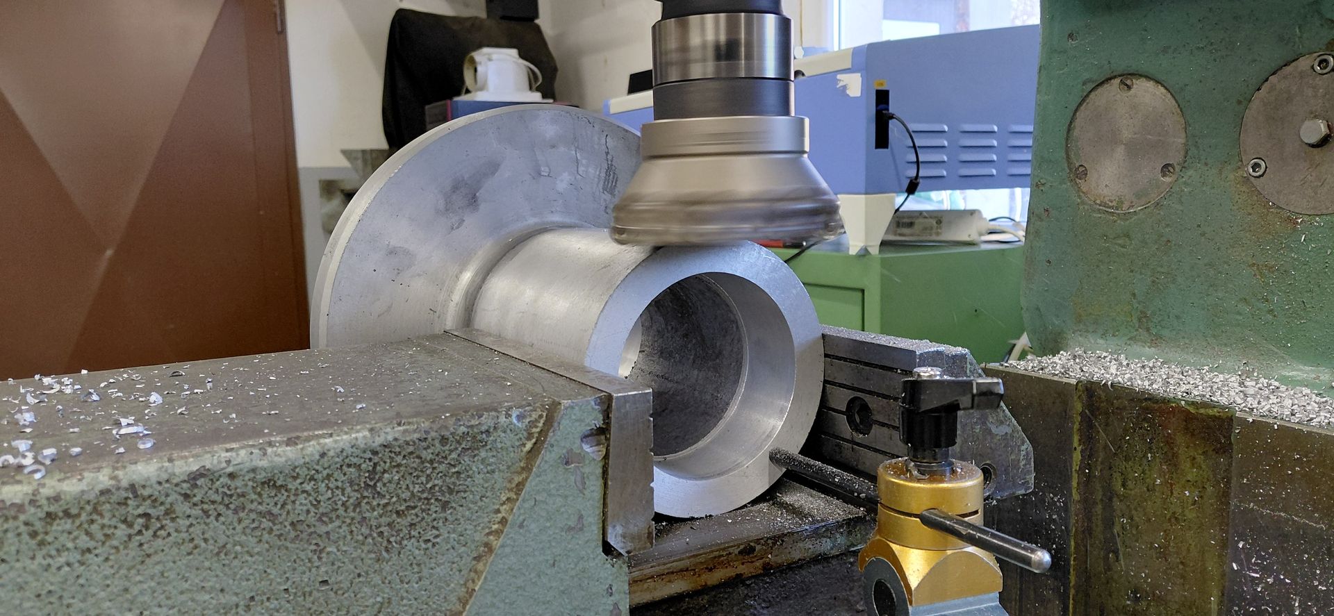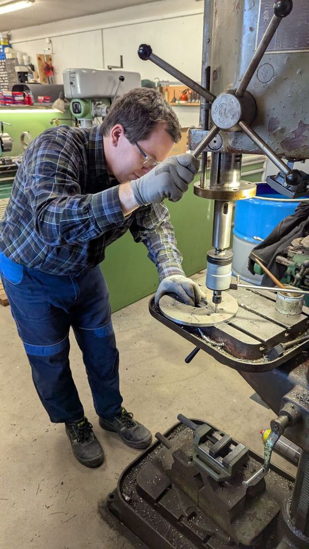 Počas predchádzajúcich dní nám Martin pripravil disky, ktoré budú slúžiť ako pohonné disky a prstence na montáž enkoderových pásikov. Všetky diely boli vyrobené z antikory. Do všetkých bolo treba vyvŕtať príslušné diery a narezať závity. Našťastie na rezanie závitov mal Martin výbornú vychytávku – automatickú hlavu s prevodom a nastaviteľným momentom.