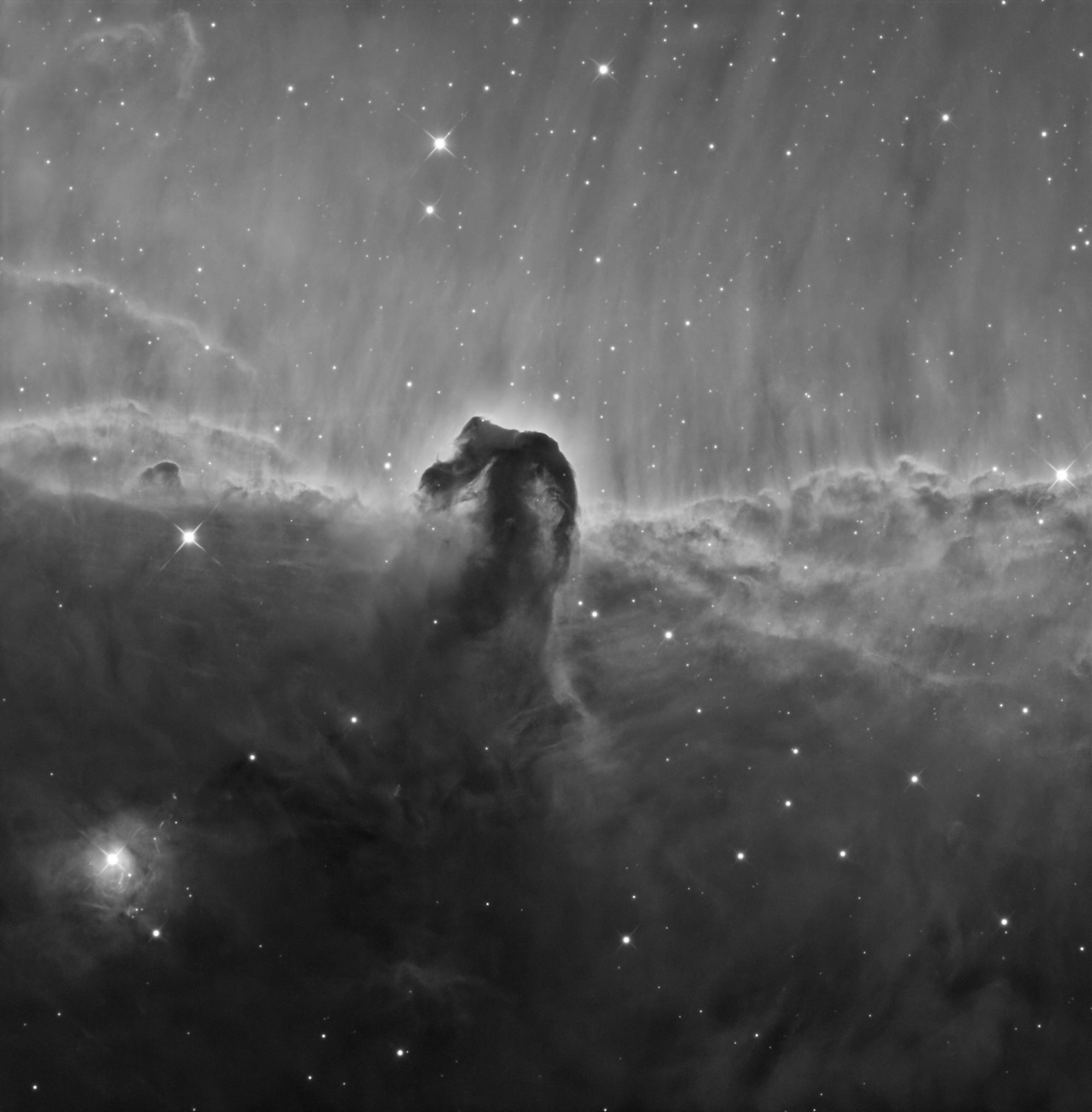 Konská hlava je tmavá hmlovina tvorená studeným plynom a prachom. Vyniká na pozadí žiariaceho vodíka. Fotografovanie tejto hmloviny je však často komplikované difrakčnými lúčmi od blízkej hviezdy Alnitak. Nachádza sa mimo obrázok, vľavo. Aj keď samotnú hviezdu nie je vidieť, jej lúče sa prejavujú hádam na kažej snímke. Aj na tejto je vidieť (síce slabé ale viditeľné) lúče v ľavej časti približne v strede.