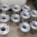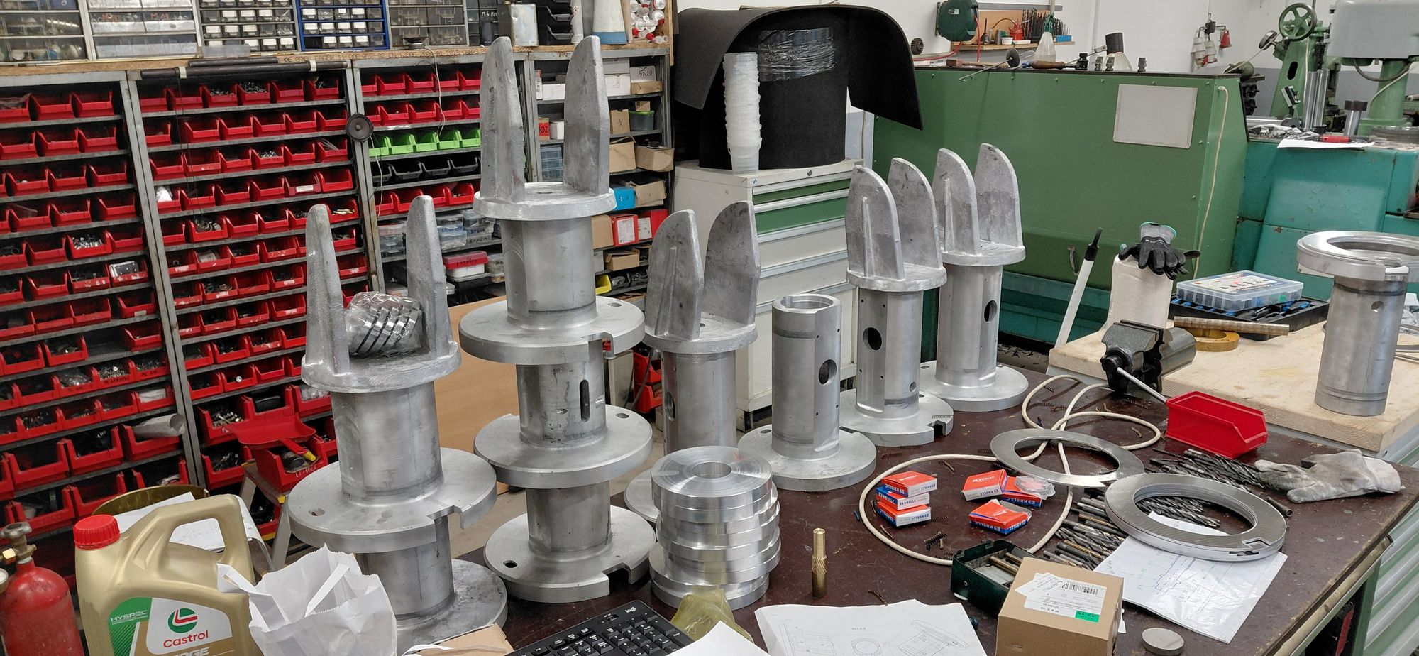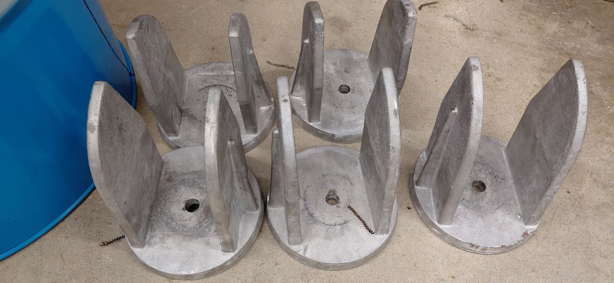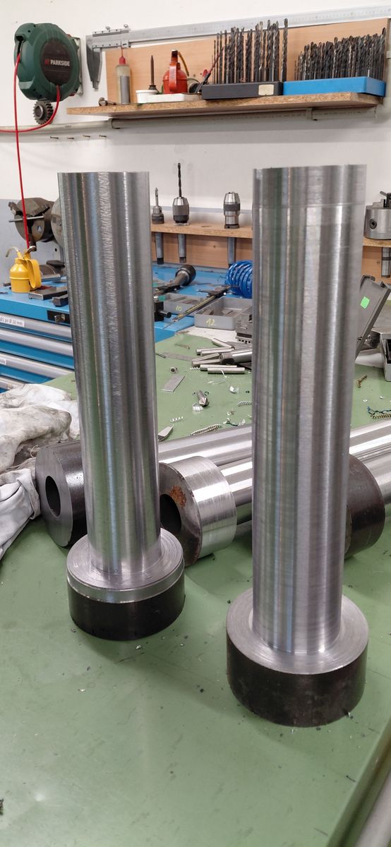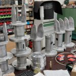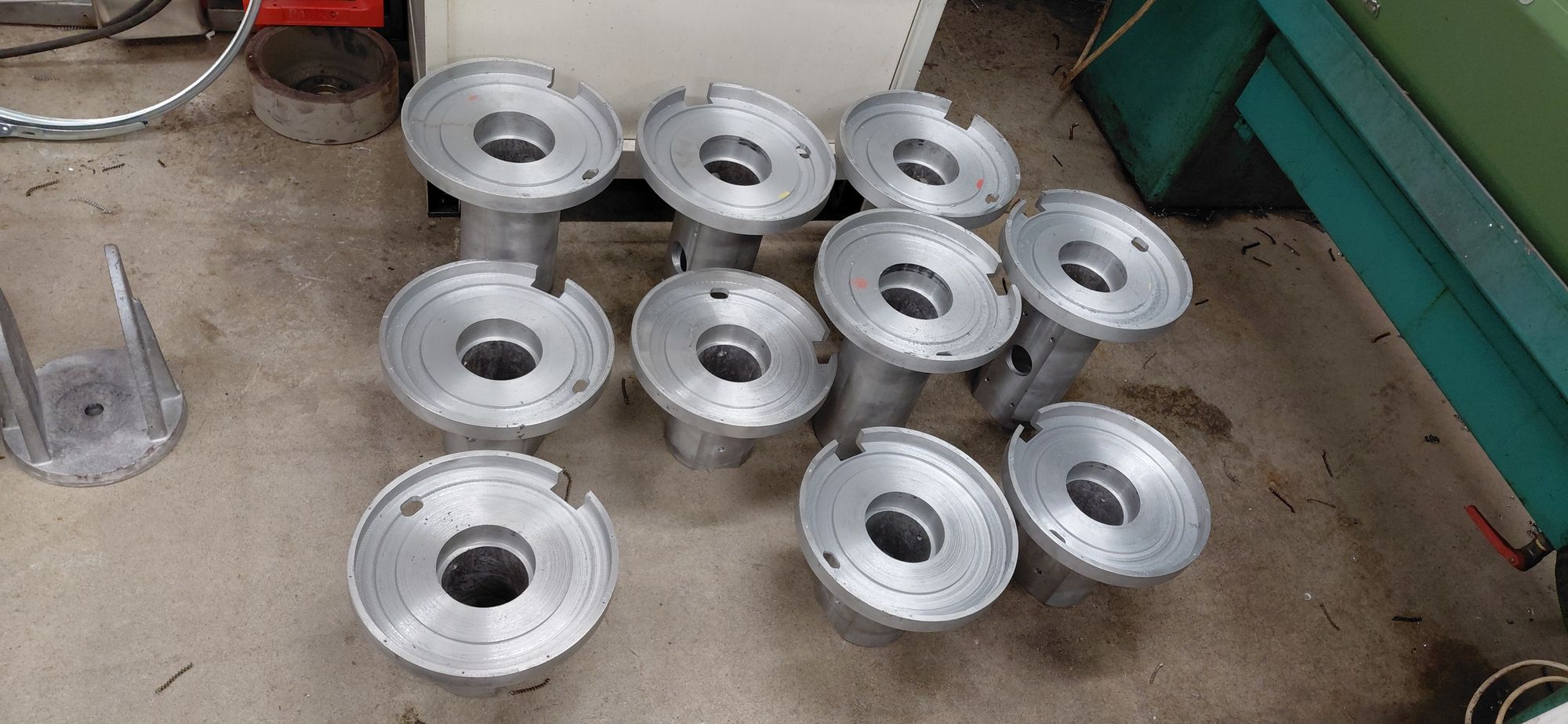 V dielni to vyzeralo ako v rozprávkovom lese plnom hliníkových hríbikov. Puzdrá osí, boli takmer hotové. Ostávali len nejaké drobnosti v povrchovej úprave. Základne boli vyčistené a pripravené na opracovanie.
