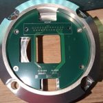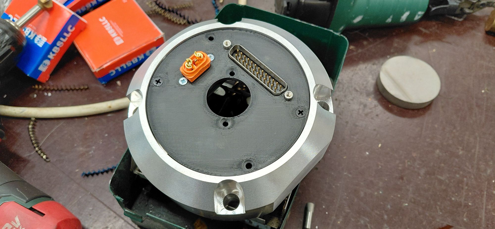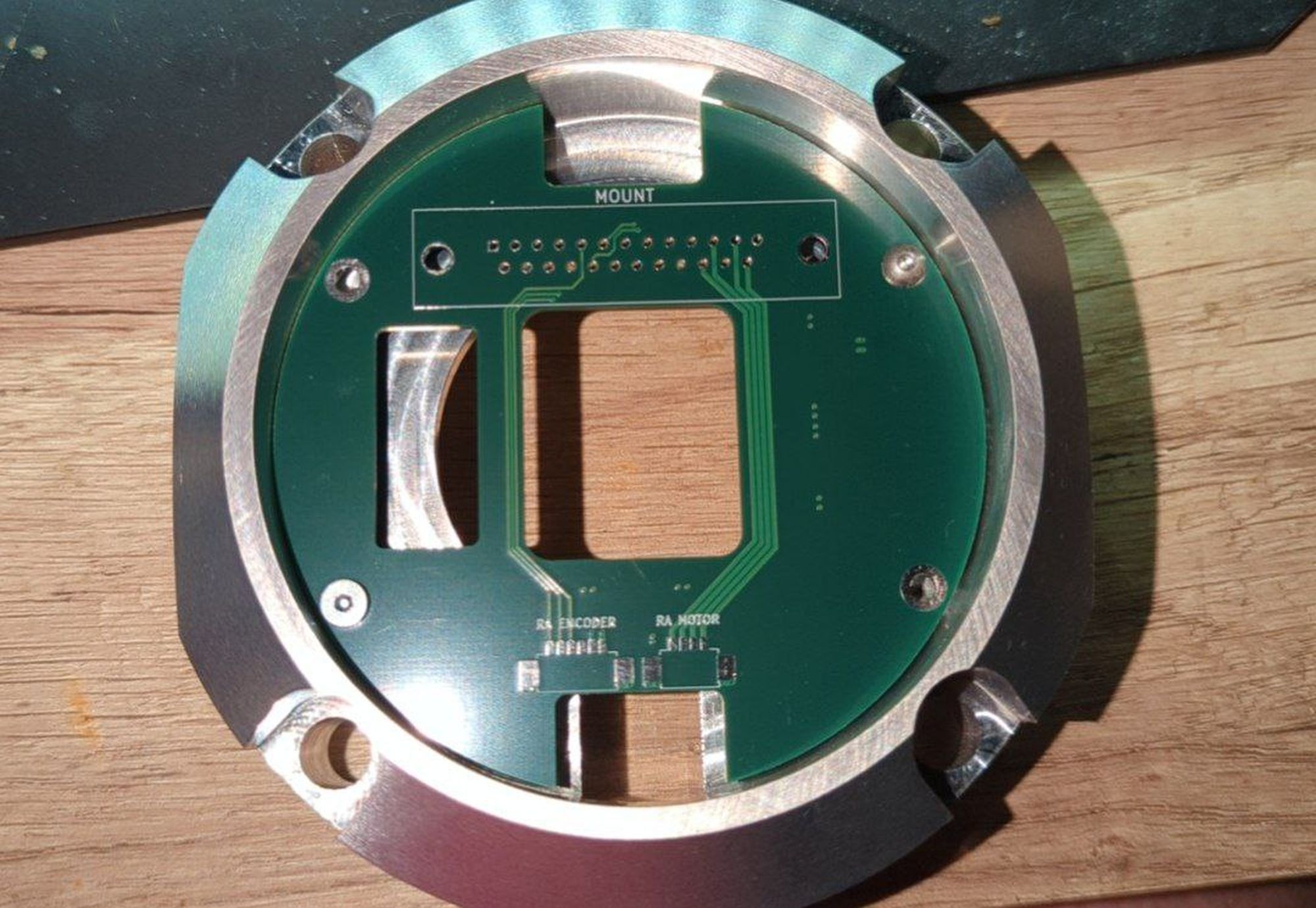 Samo predviedol jeden z Čínskych darčekov – koncovku na RA os. Do hlavnej diery pripravil plošný spoj na mieru. Plošný spoj zabezpečuje rozvod z hlavného 25 poinového konektora riadenia na jednotlivé komponenty riadenia montáže. Krycí panel zároveň obsahuje USB v strede, a napájací konektor (oranžový). To znamená, že južným koncom RA osi bude montáž pripojená k napájaniu a počítaču. Napájanie povedie vnútrom montáže k upínacej platni na konci DE osi, kde bude umiestnený rozvádzač energie pre primontované zariadenia (kamery, vyhrievanie, zaostrovanie, flat panel, …) a taktiež USB Hub. Pohon montáže (napájanie motorov, napájanie a snímanie enkodérov) bude vedené cez uvedený 25pinový konektor, ktorý jedným káblom spojí montáž s riadením. Riadenie zabezpečuje OnStep jednotka umiestnená  napríklad na stĺpe montáže.