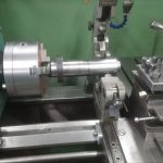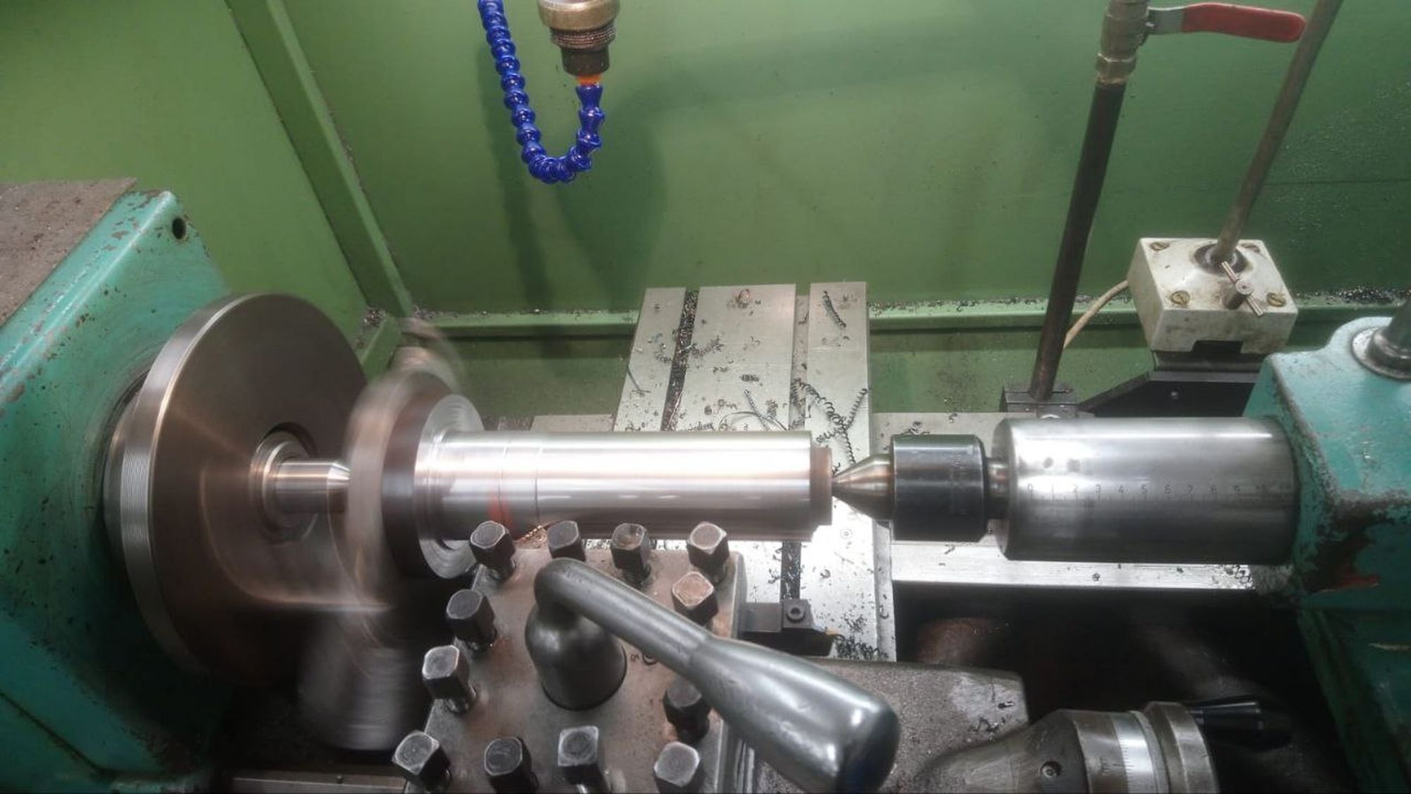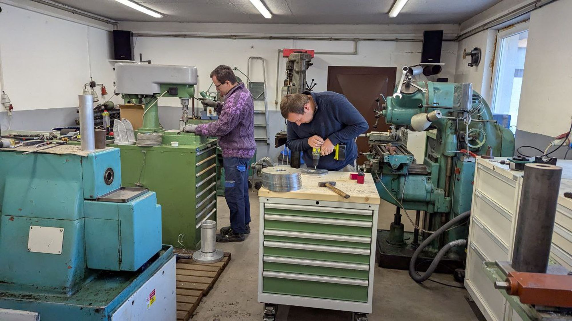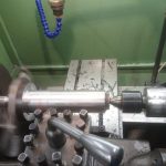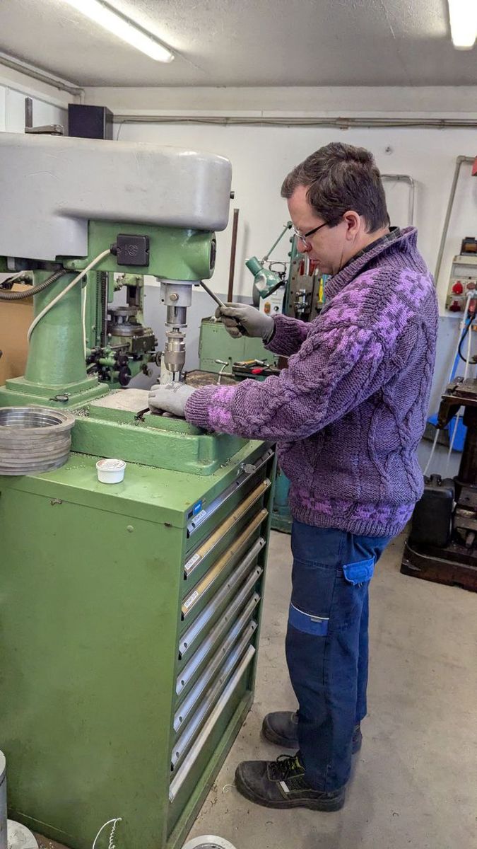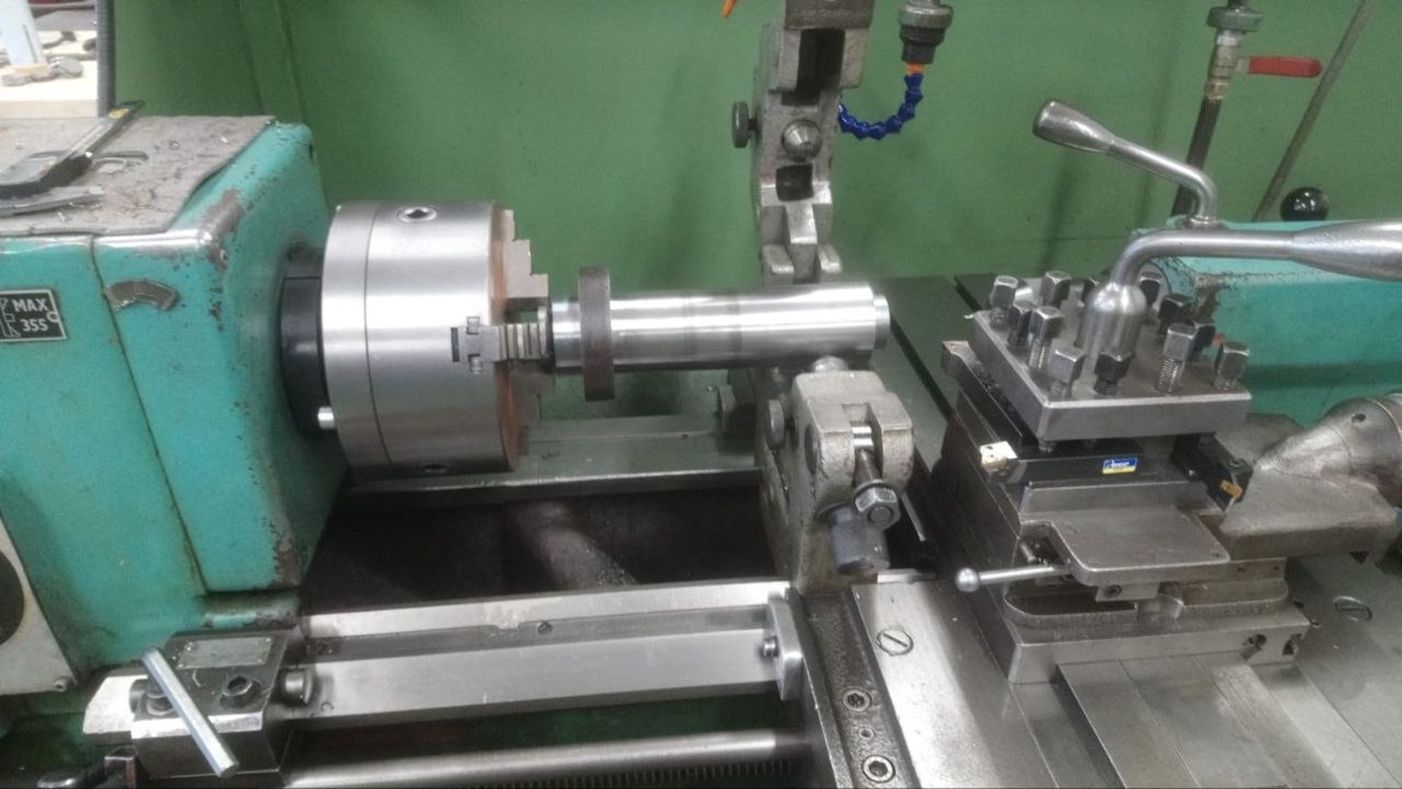 Keď Martin rozdal pracovné príkazy, bezpečnostné inštrukcie a dohliadol, že vieme, čo robíme, pustil sa do opracovania osí. Na obrázku, kde je vidieť neopracovaný povrch na konci, si možno urobiť predstavu o množstve odstráneného materiálu. Pri tejto práci odletovali celkom žeravé oceľové strunky, ktoré sme na konci zametali po celej dielni. Ja som doma ešte na tretí deň vyťahoval tri zatavené strunky z podrážky topánok.